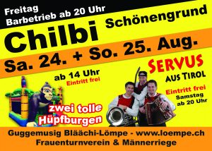 Die Guggemusik Bläächi-Lömpe lädt auch dieses Jahr wieder zur Schönegröndler Chilbi vom Freitag 23. bis Sonntag 25. August ins Festzelt auf dem Gemeindehausplatz ein.
