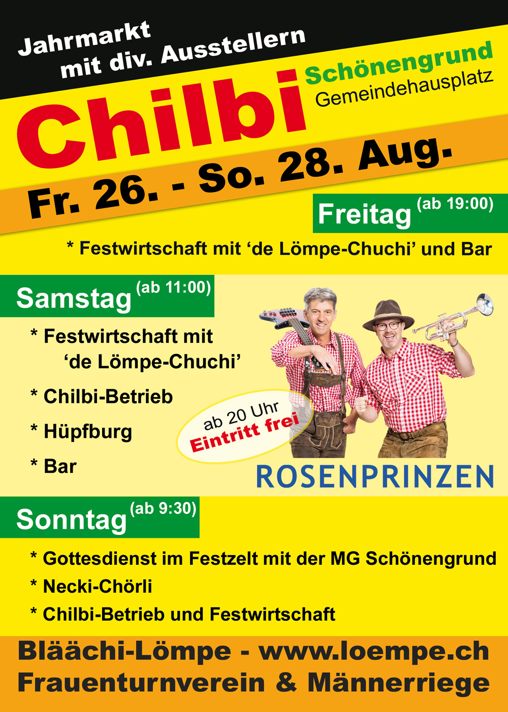 Am Samstag öffnet das Festzelt und die ‚Lömpe-Chuchi‚ um 11 Uhr. Am Nachmittag sorgen div. Schausteller und eine Hüpfburg für ordentlich Chilbi-Betrieb.
