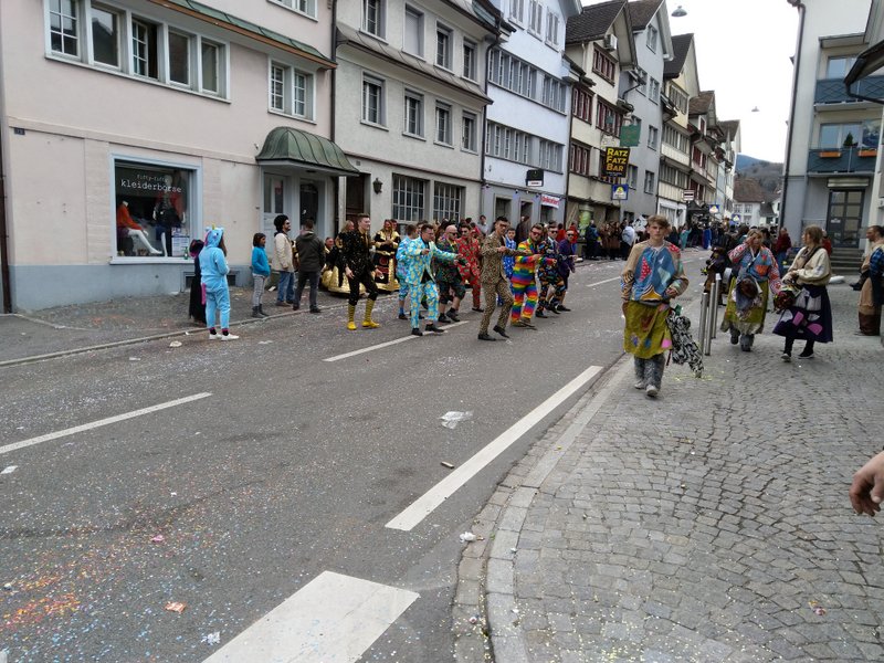 Kurz darauf ging es mit dem Car weiter nach Altstätten an den Tschätteri. Leider funktionierte der Umzug welcher dieses Jahr mit einem Rundlauf mit 52 (!) Gruppen stattfinden sollte nicht so recht. Irgendwie stockte es immer wieder und wir sind nicht wirklich weit gekommen. Im Anschluss waren für uns drei Auftrittszeiten vorgesehen. Den ersten Auftritt bestritten wir zusammen mit den Gottlieber Schnogge auf der Bühne Breite. Dabei wurde abwechselnd musiziert um die Stimmung anzuheizen. Für uns ein Novum aber es hat absolut Spass gemacht! Weiter ging es dann um 23:30 Uhr vor dem ‚Drei König‚ wo wir alleine spielen durften (oder mussten?) bis dann mit gut 30 minütiger Verspätung um gut 2 Uhr Nachts ein weiterer ‚Battle‘ zusammen mit den Rhii-Jooli aus Rüti vor dem Rathaus stattfand. Liebe Rhii-Jooli besten Dank für den tollen Auftritt den wir mit euch machen durften!