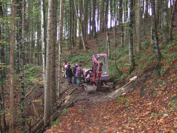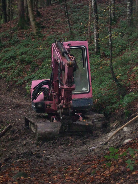 • 09.00 Uhr – Der Bagger naht! Waldemar bahnt sich den Weg durch den Wald.