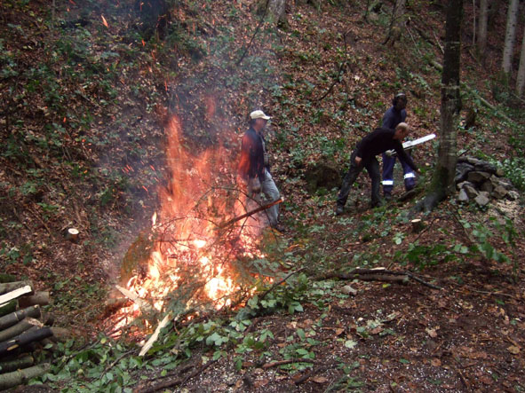 • 09.35 Uhr – Brösmelis Waldschuttfeuer will nicht brennen! Alles ist zu nass